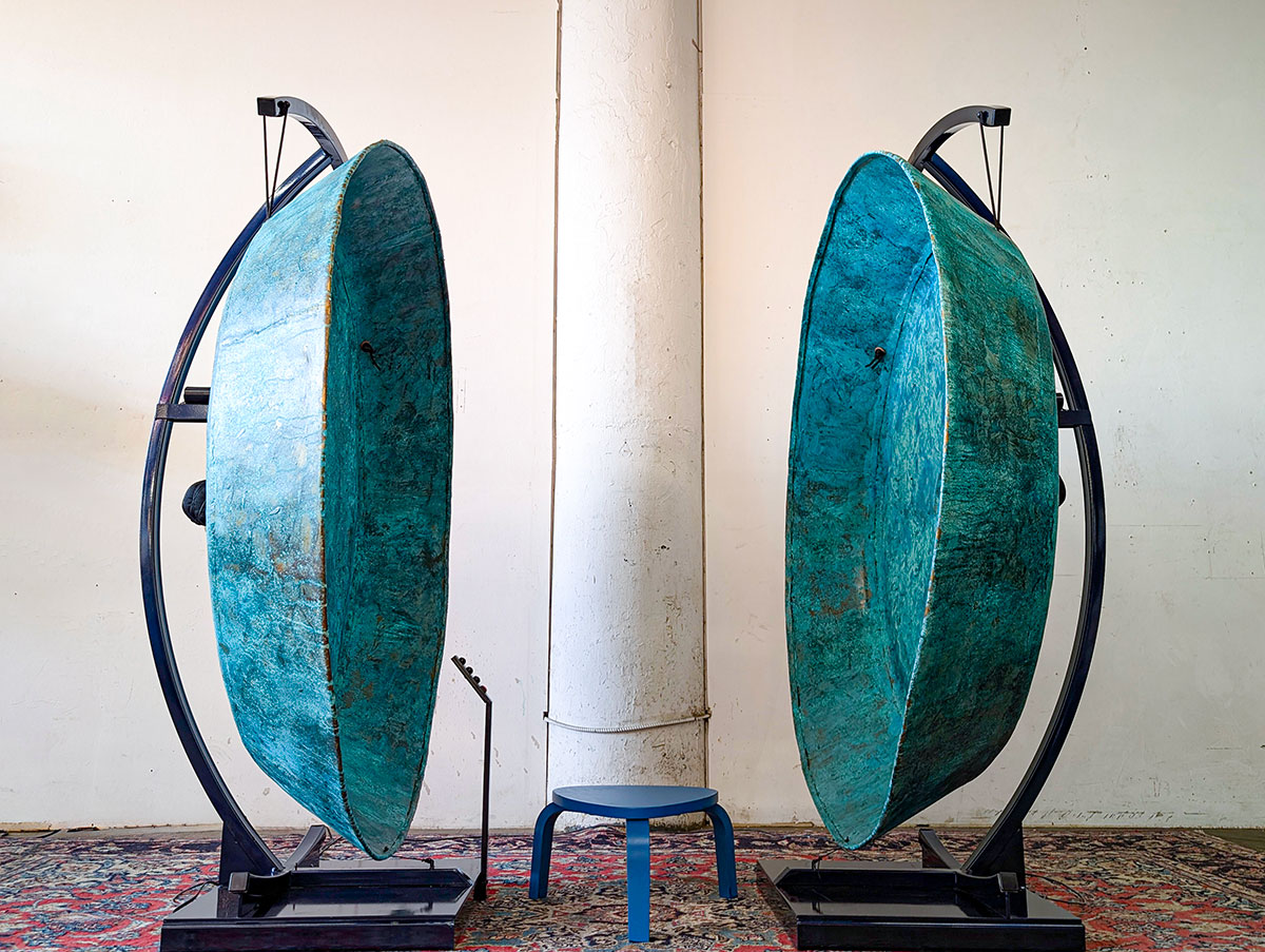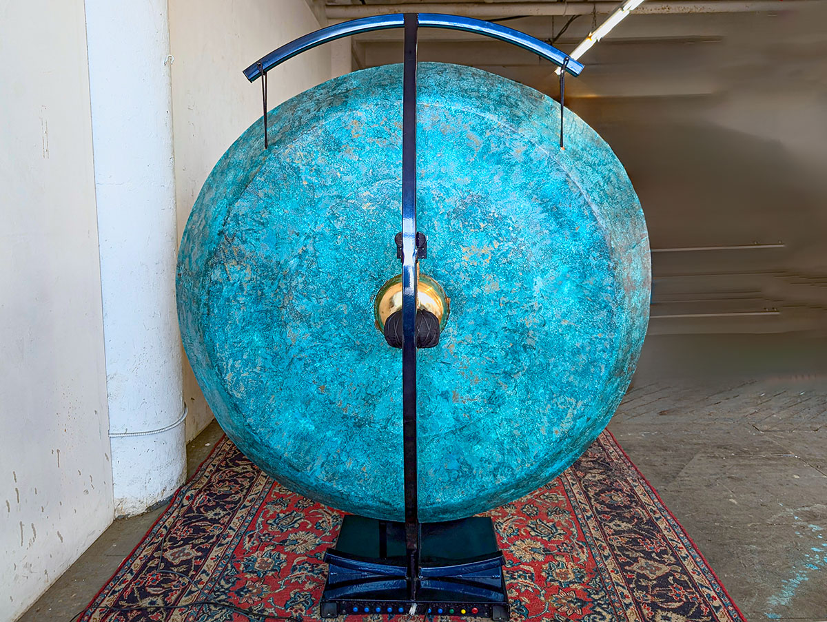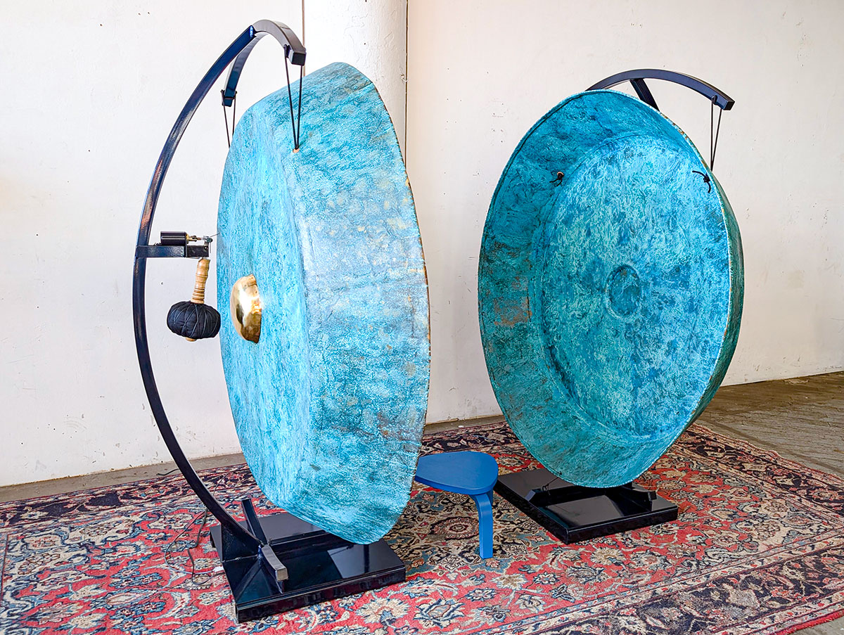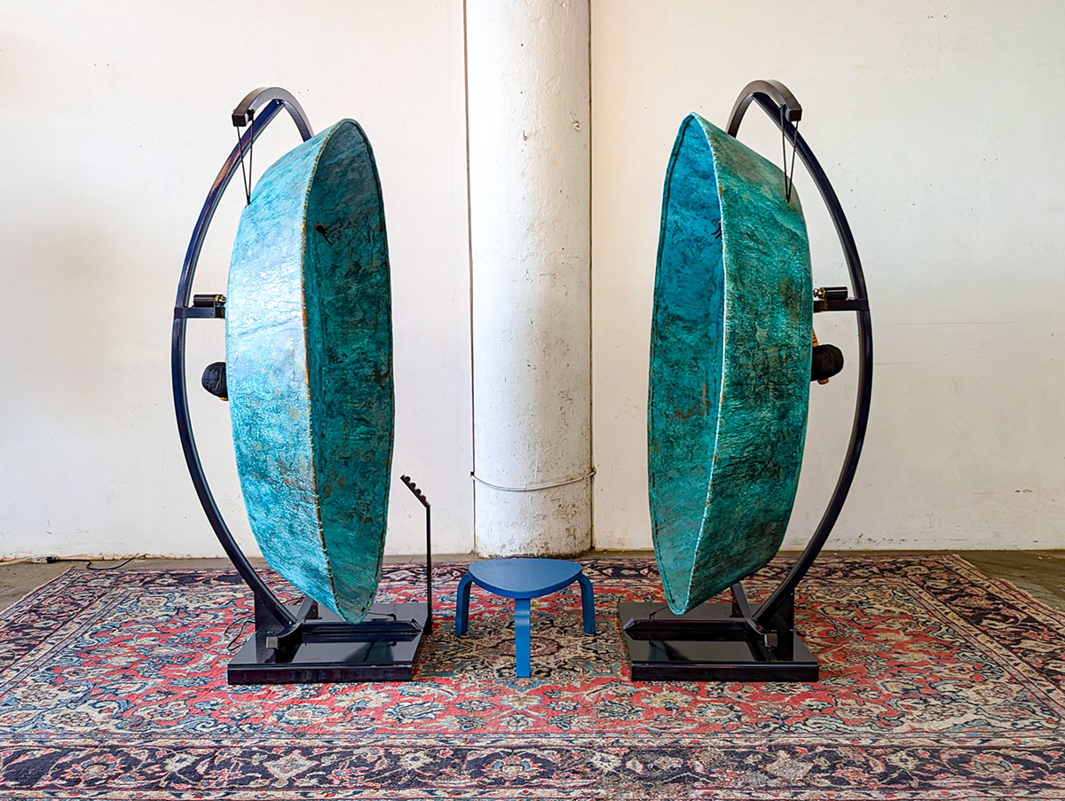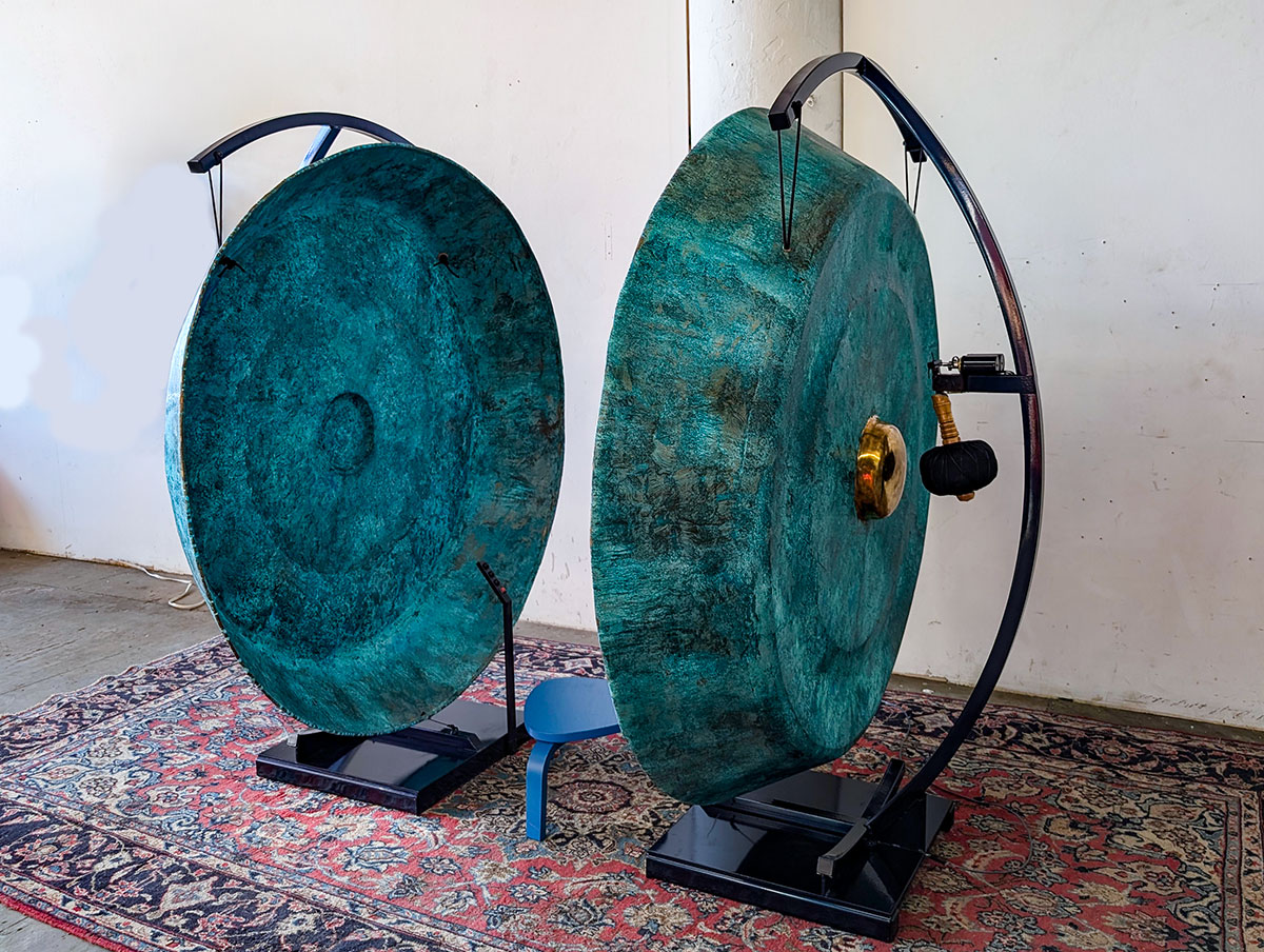 Description: Two 5ft (152cm) Green Bronze Patinated Steel and brass gongs that resonate around 38 Hz on freestanding powder coated steel mounts with aluminum, wood, bicycle tire and fabric robotic gong mallet mechanisms connected to a physical computing system.