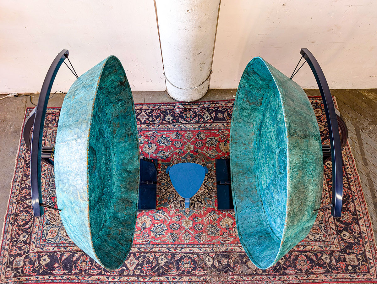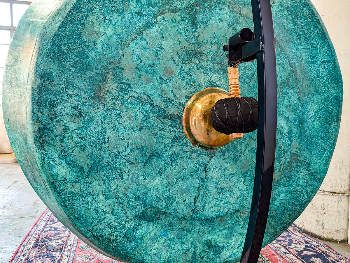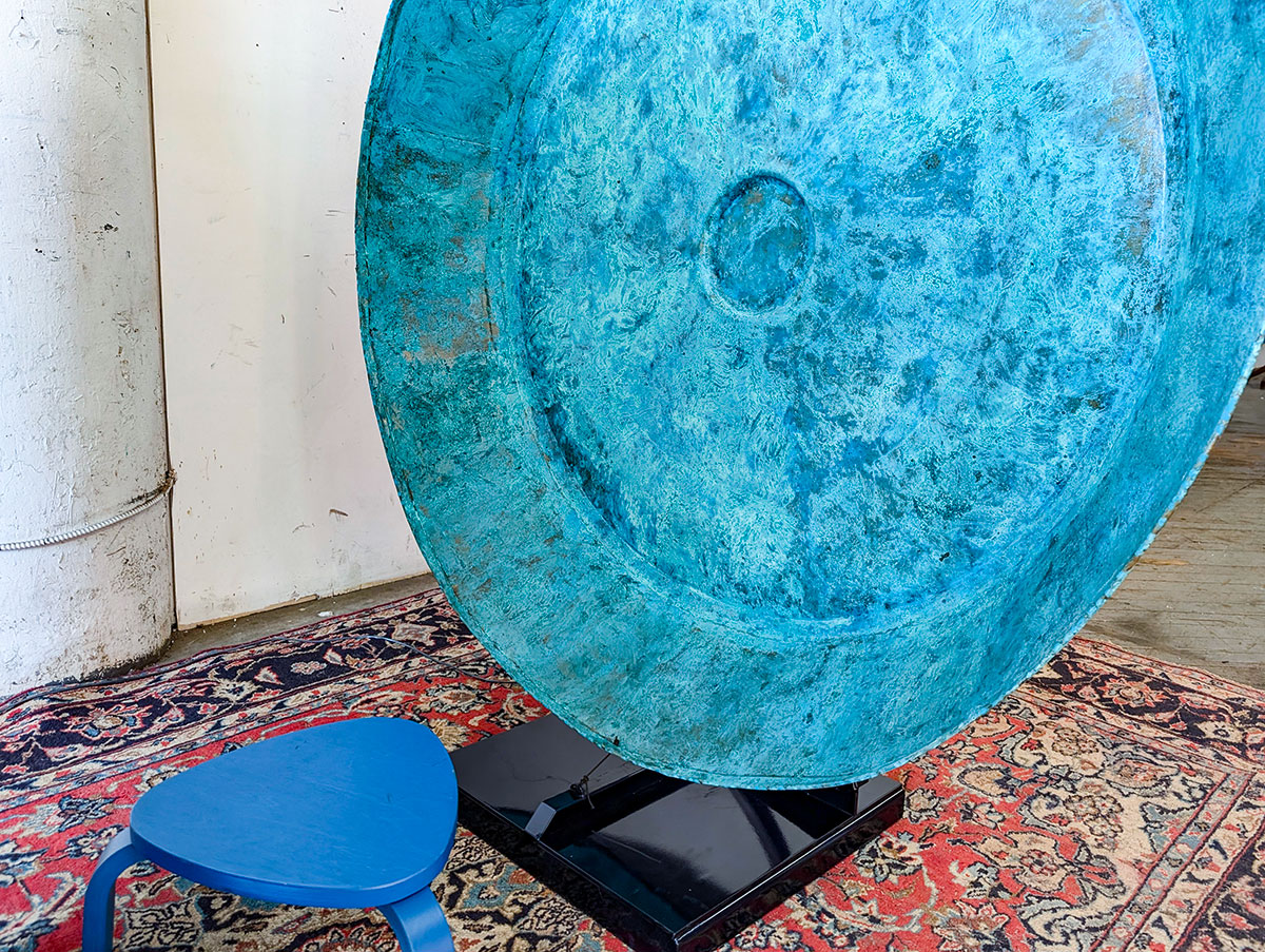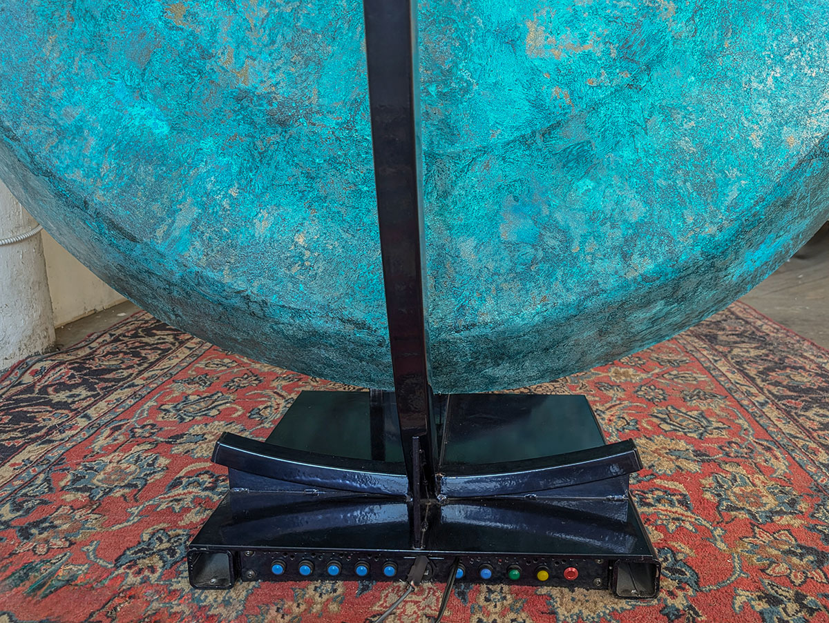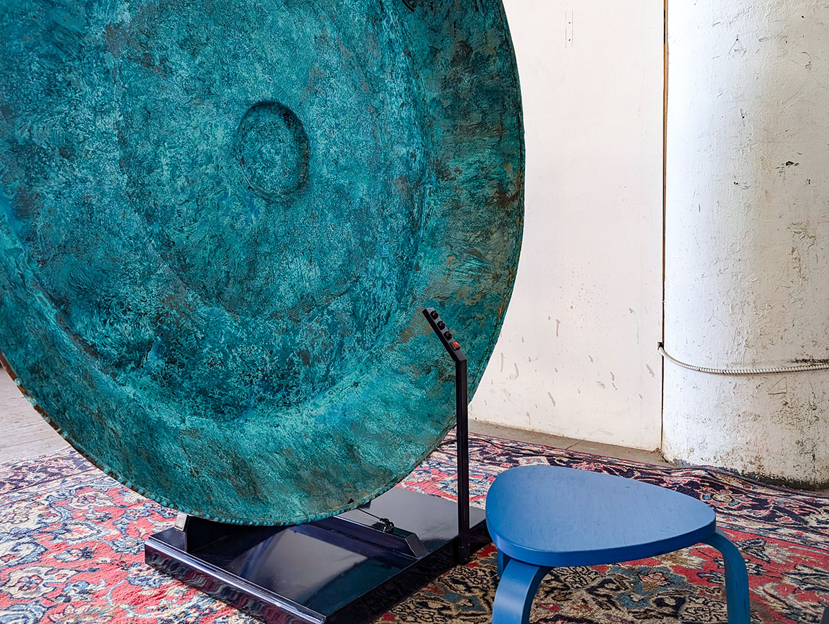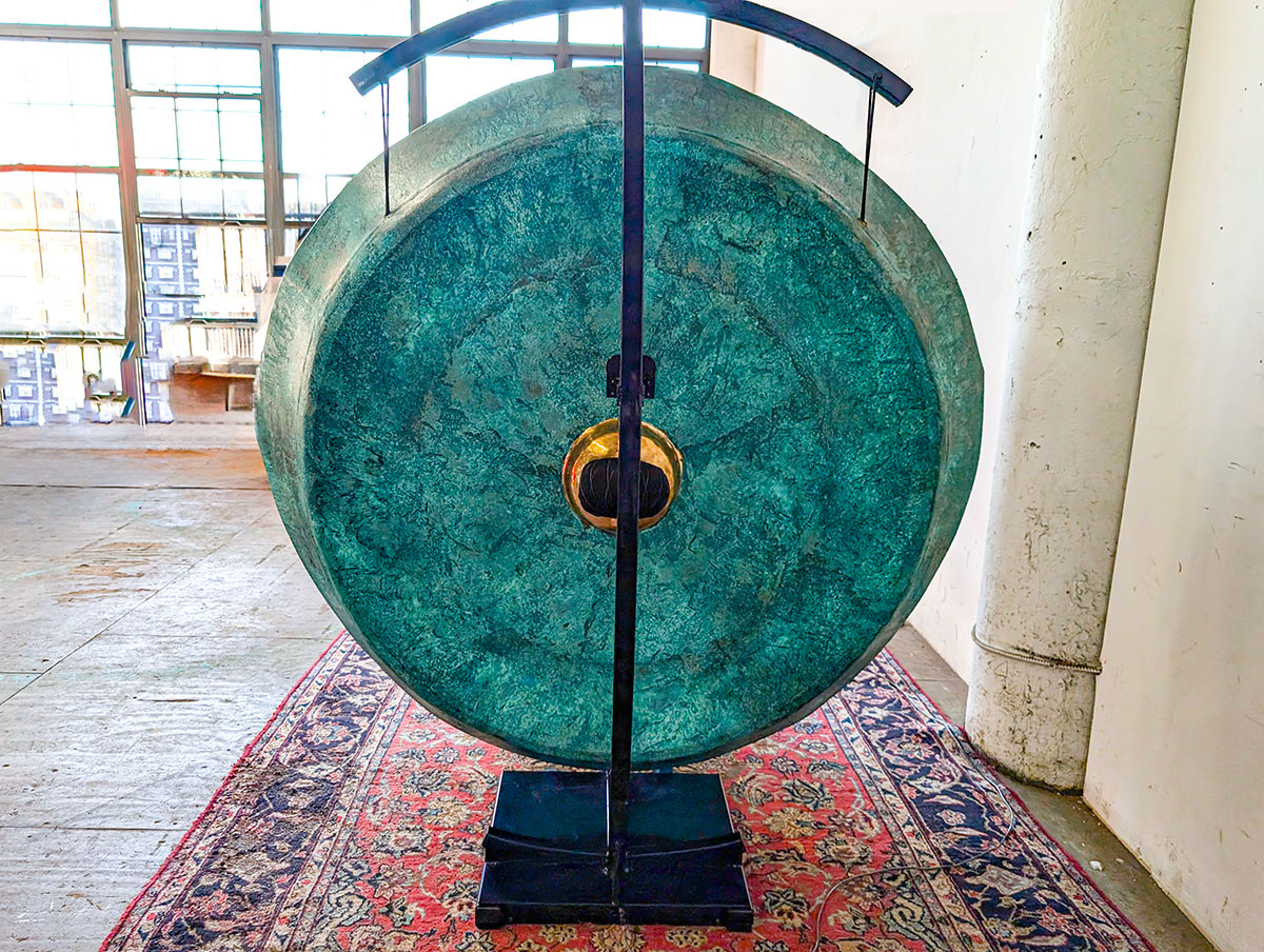 Description: Two 5ft (152cm) Green Bronze Patinated Steel and brass gongs that resonate around 38 Hz on freestanding powder coated steel mounts with aluminum, wood, bicycle tire and fabric robotic gong mallet mechanisms connected to a physical computing system.