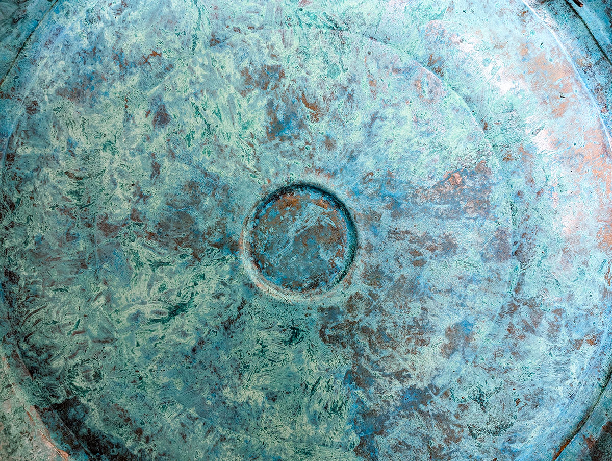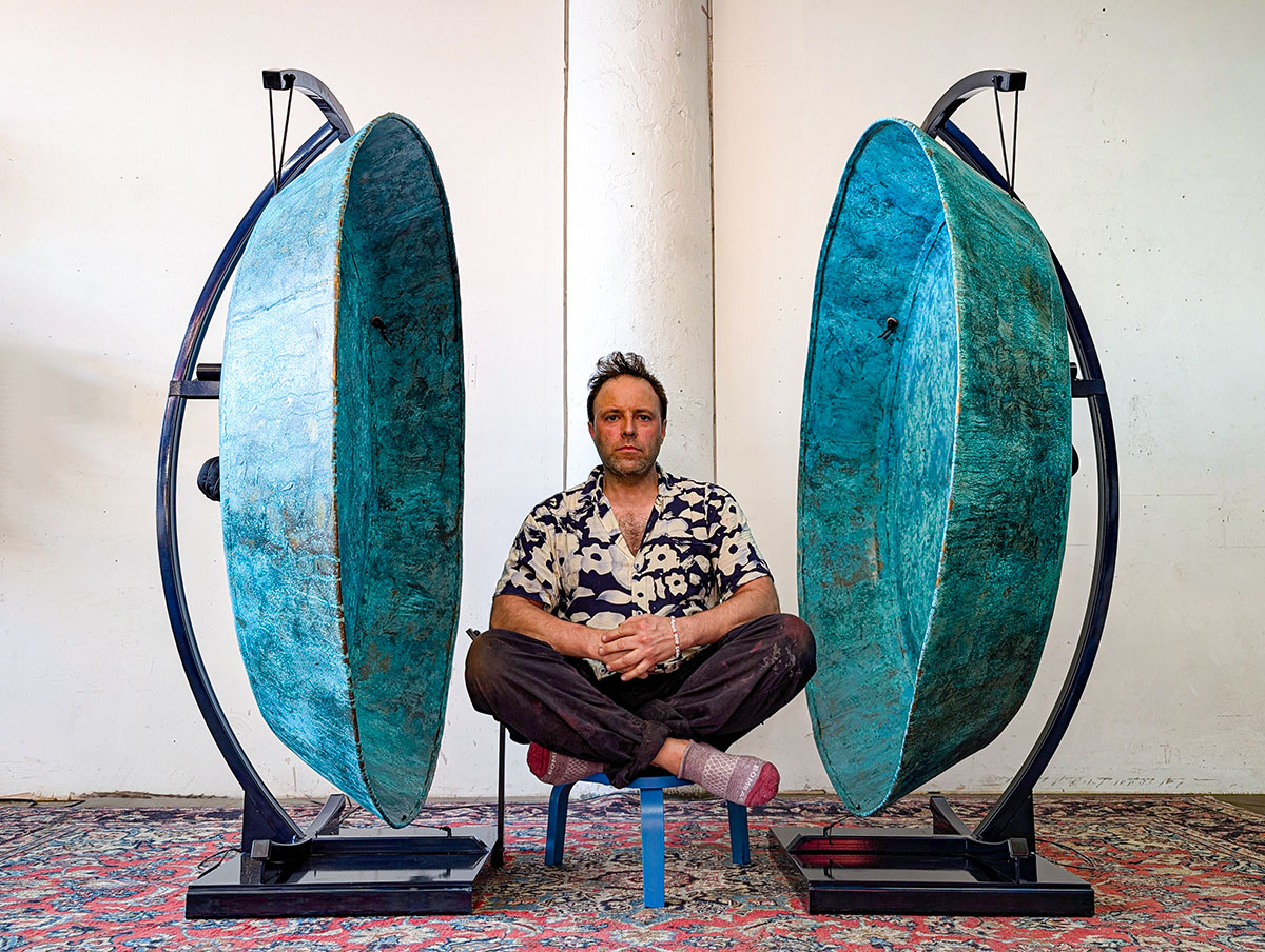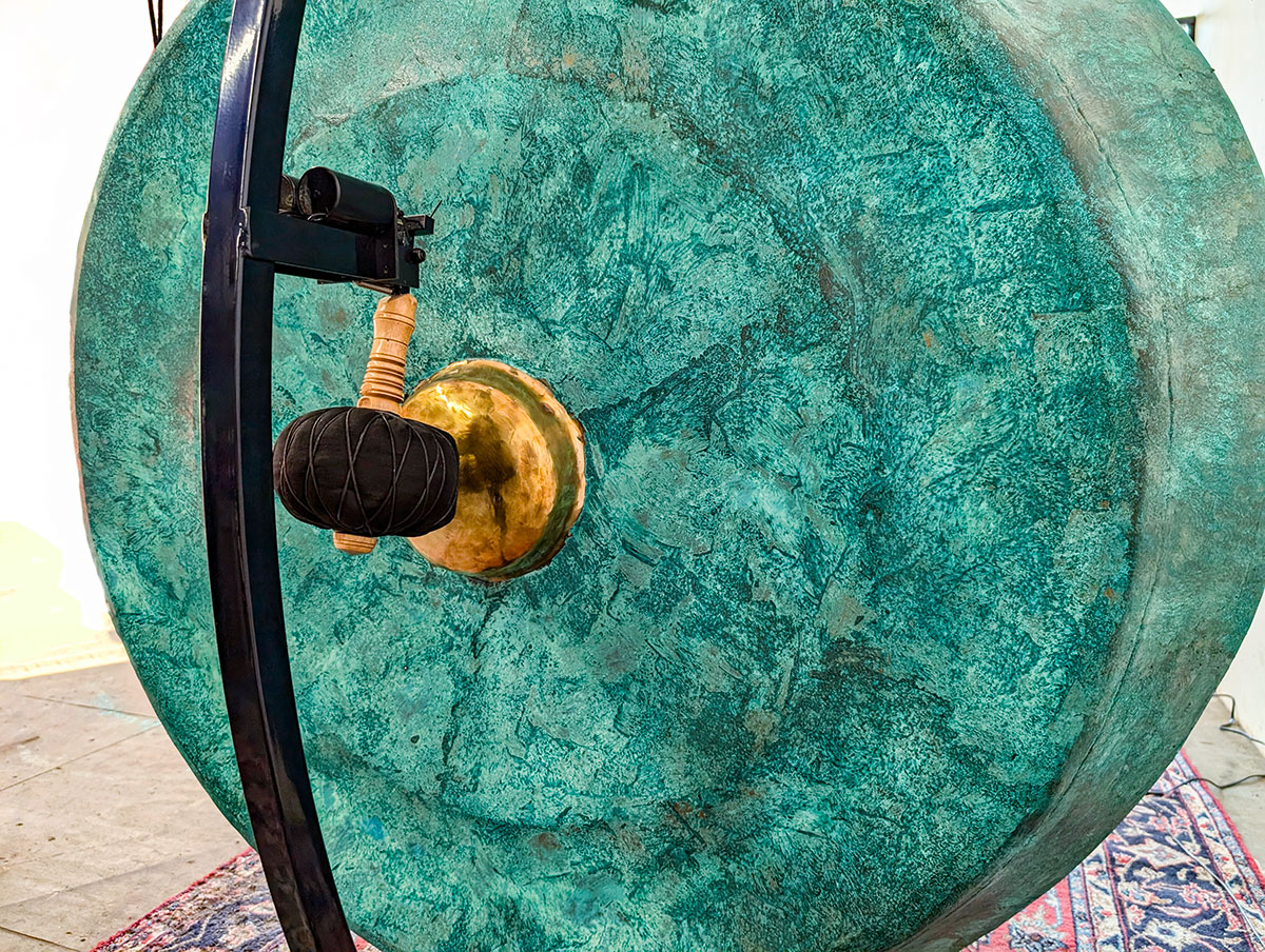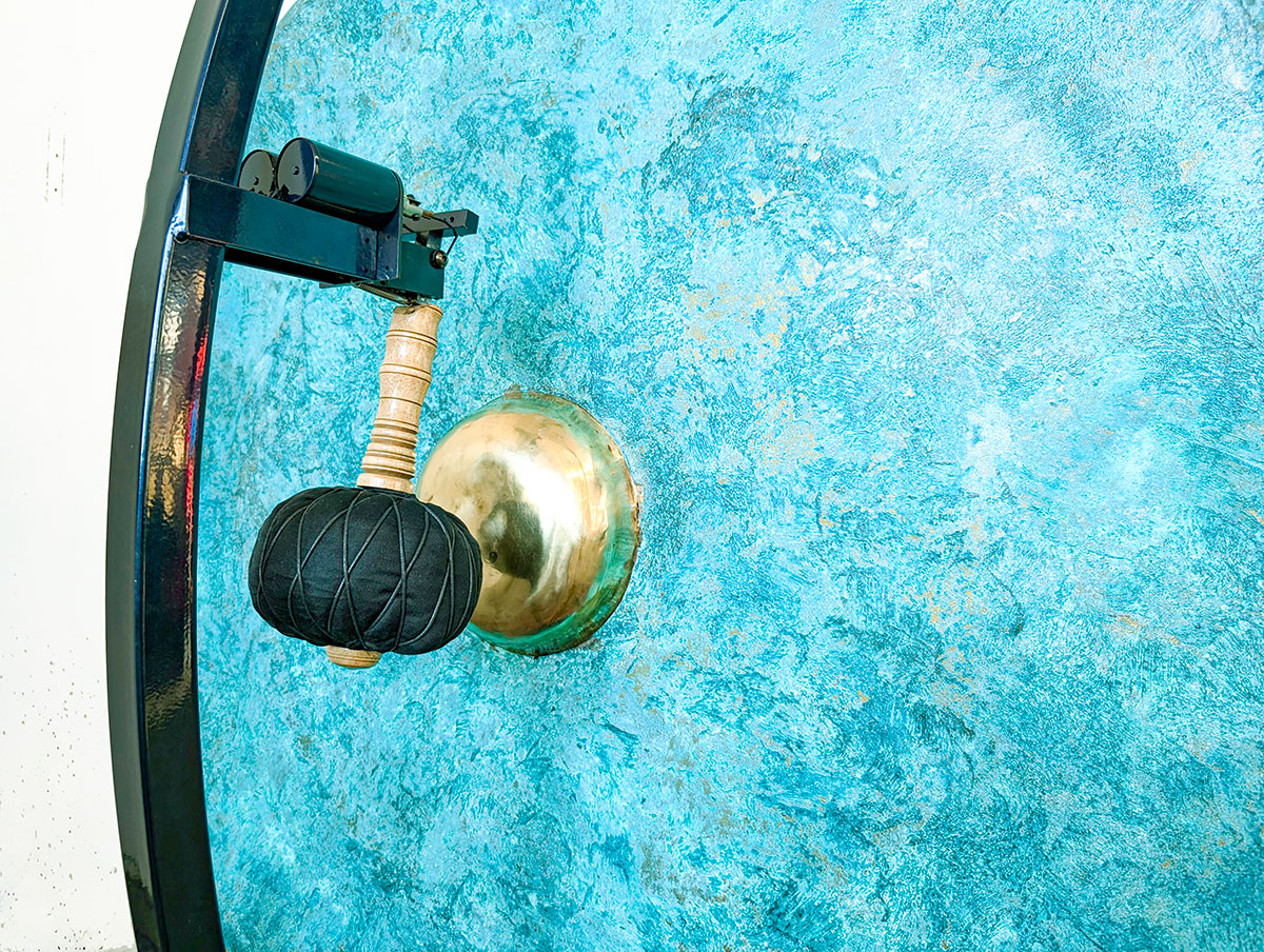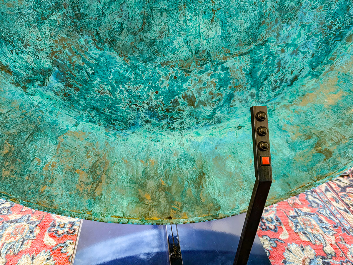 Description: Two 5ft (152cm) Green Bronze Patinated Steel and brass gongs that resonate around 38 Hz on freestanding powder coated steel mounts with aluminum, wood, bicycle tire and fabric robotic gong mallet mechanisms connected to a physical computing system.