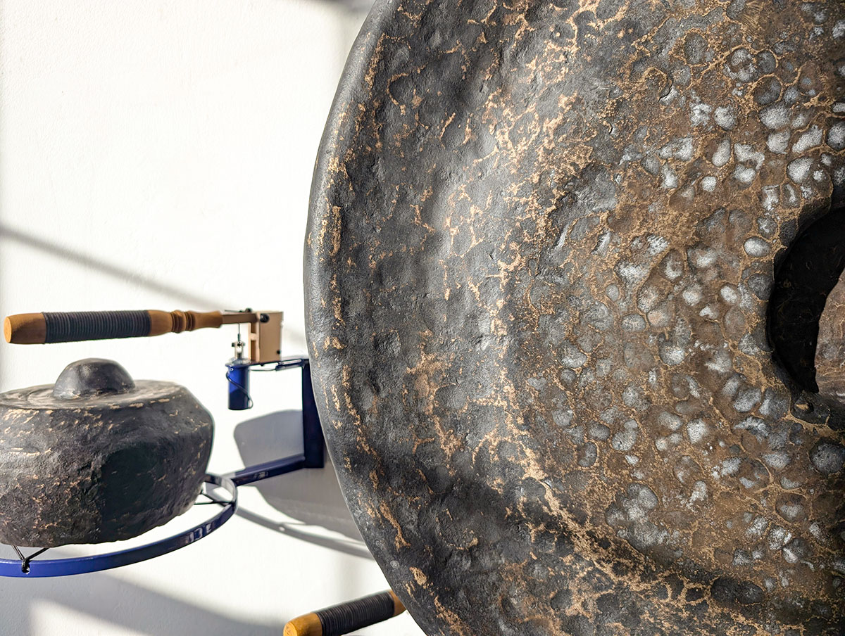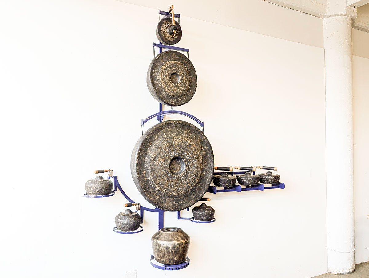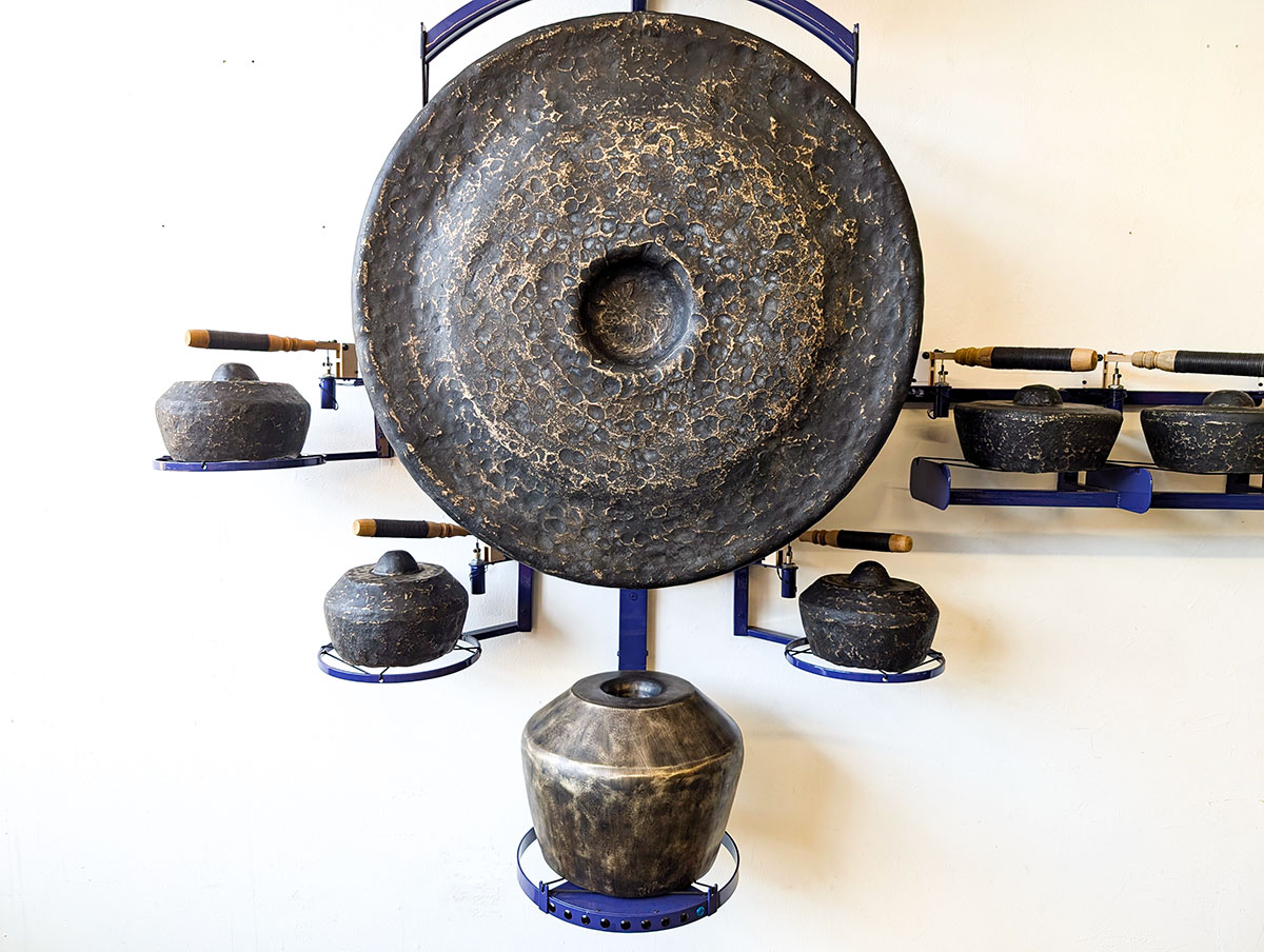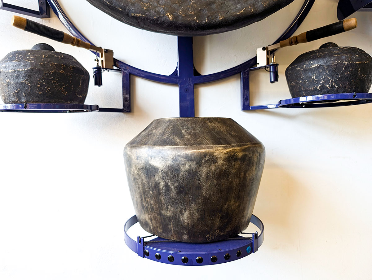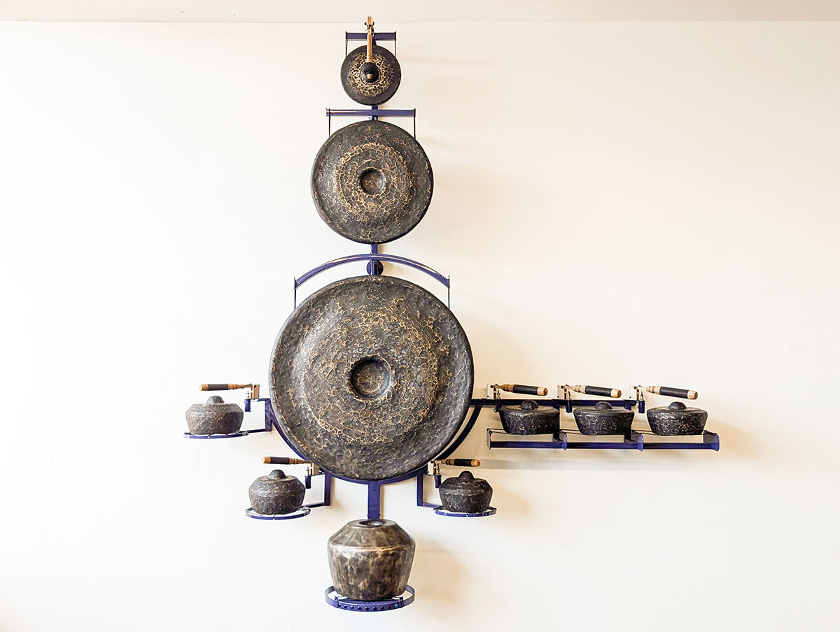 Description: Gamelatron Indigo Roh, is a sonic kinetic sculpture by Aaron Taylor Kuffner, featuring 10 hand forged patinated bronze gongs including a 80cm Gong, a 50cm Kempul, a Klentong, a kenong, and 6 Bonang barung, on a powder coated welded stainless steel wall mounted sculpture with anodized aluminum and teak electromechanical mallets and physical computing system.