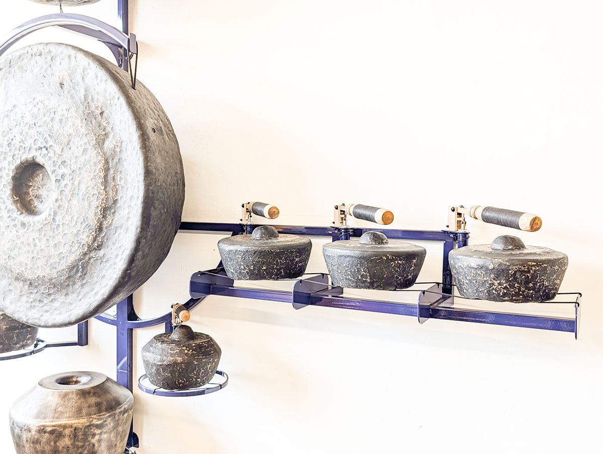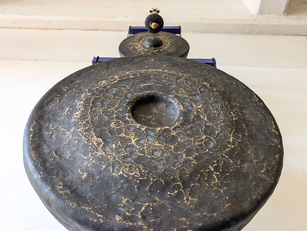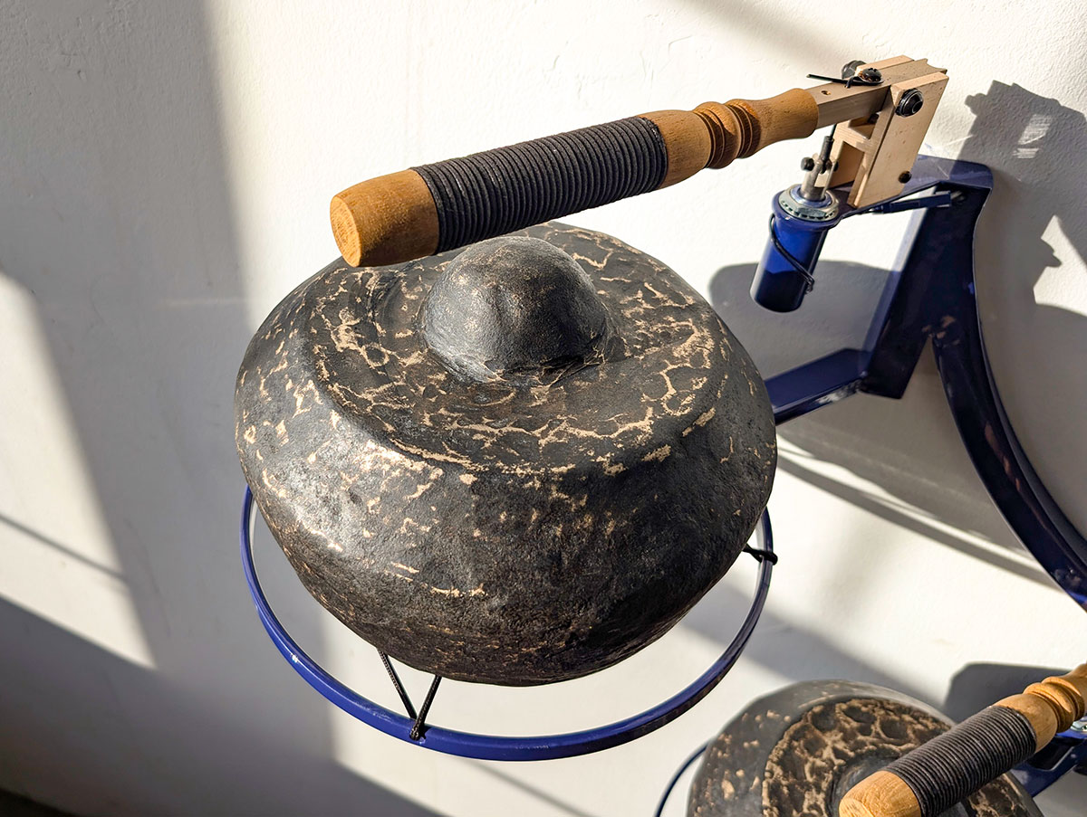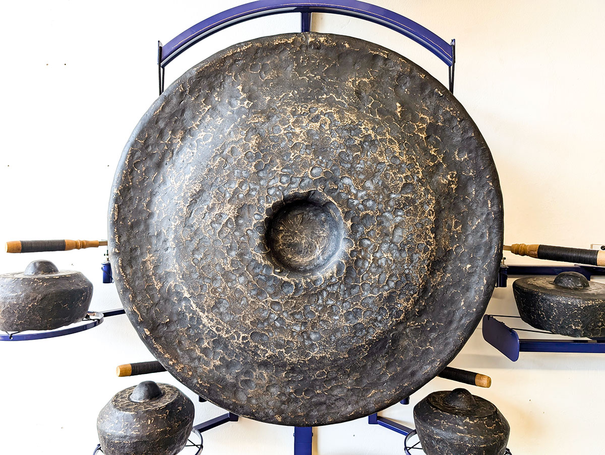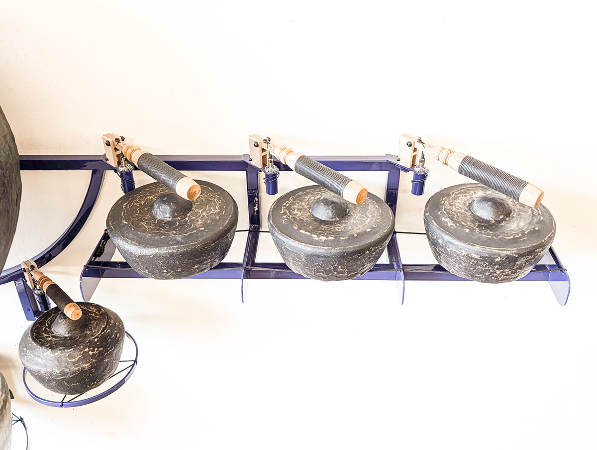 Description: Gamelatron Indigo Roh, is a sonic kinetic sculpture by Aaron Taylor Kuffner, featuring 10 hand forged patinated bronze gongs including a 80cm Gong, a 50cm Kempul, a Klentong, a kenong, and 6 Bonang barung, on a powder coated welded stainless steel wall mounted sculpture with anodized aluminum and teak electromechanical mallets and physical computing system.