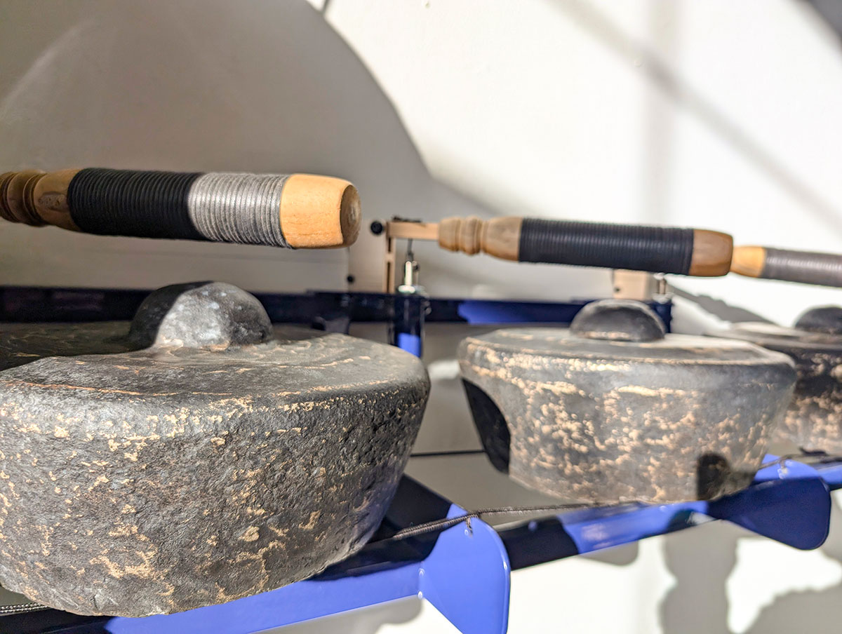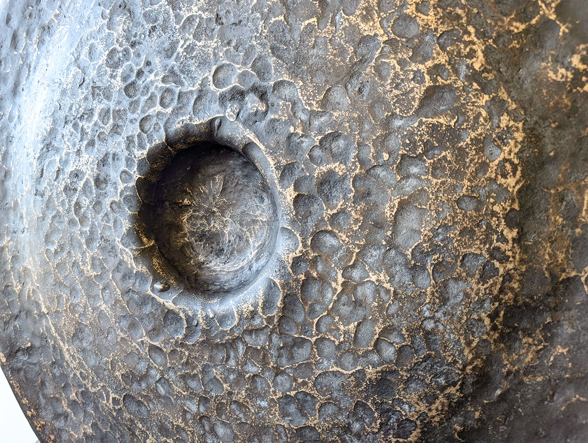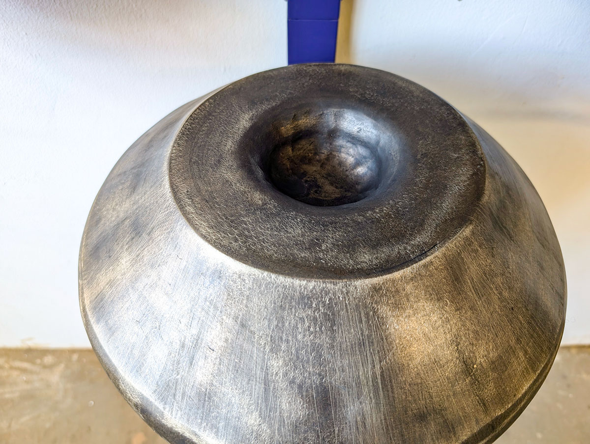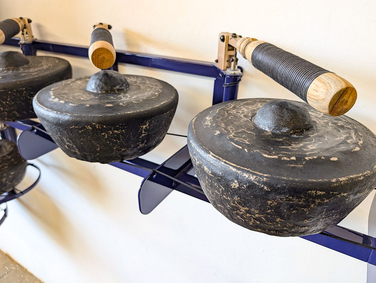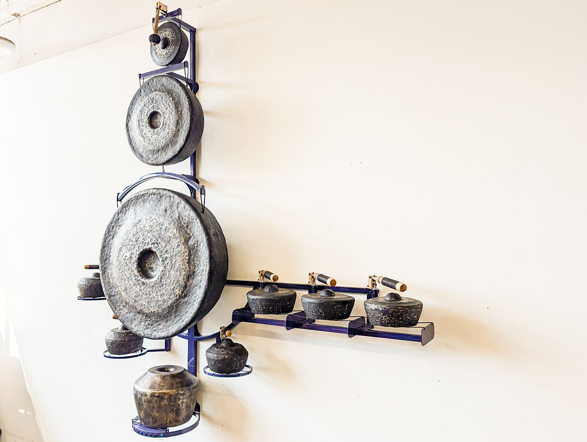 Description: Gamelatron Indigo Roh, is a sonic kinetic sculpture by Aaron Taylor Kuffner, featuring 10 hand forged patinated bronze gongs including a 80cm Gong, a 50cm Kempul, a Klentong, a kenong, and 6 Bonang barung, on a powder coated welded stainless steel wall mounted sculpture with anodized aluminum and teak electromechanical mallets and physical computing system.