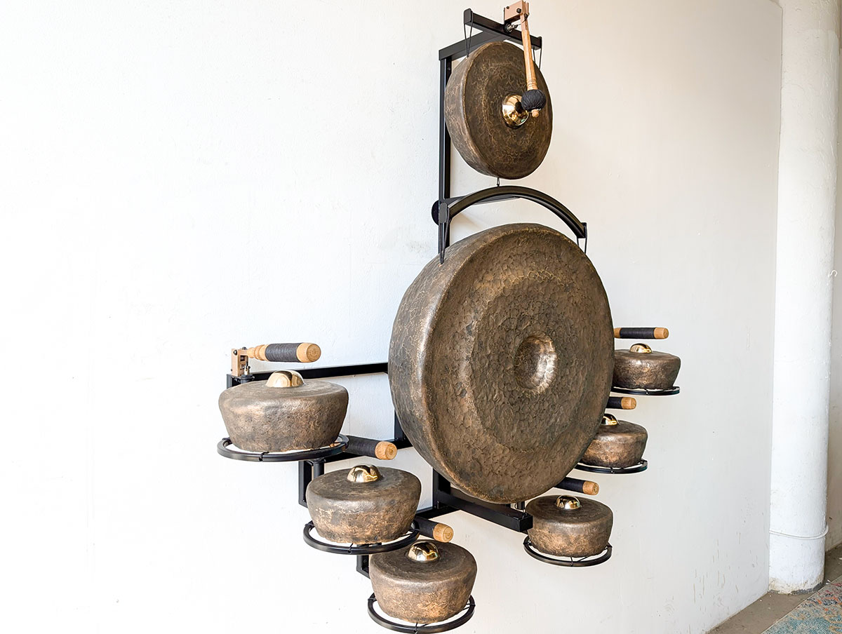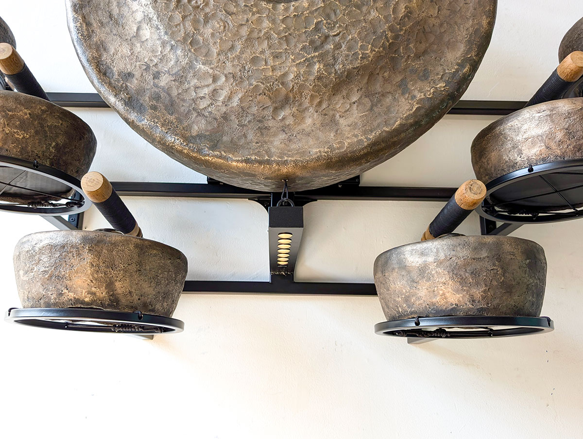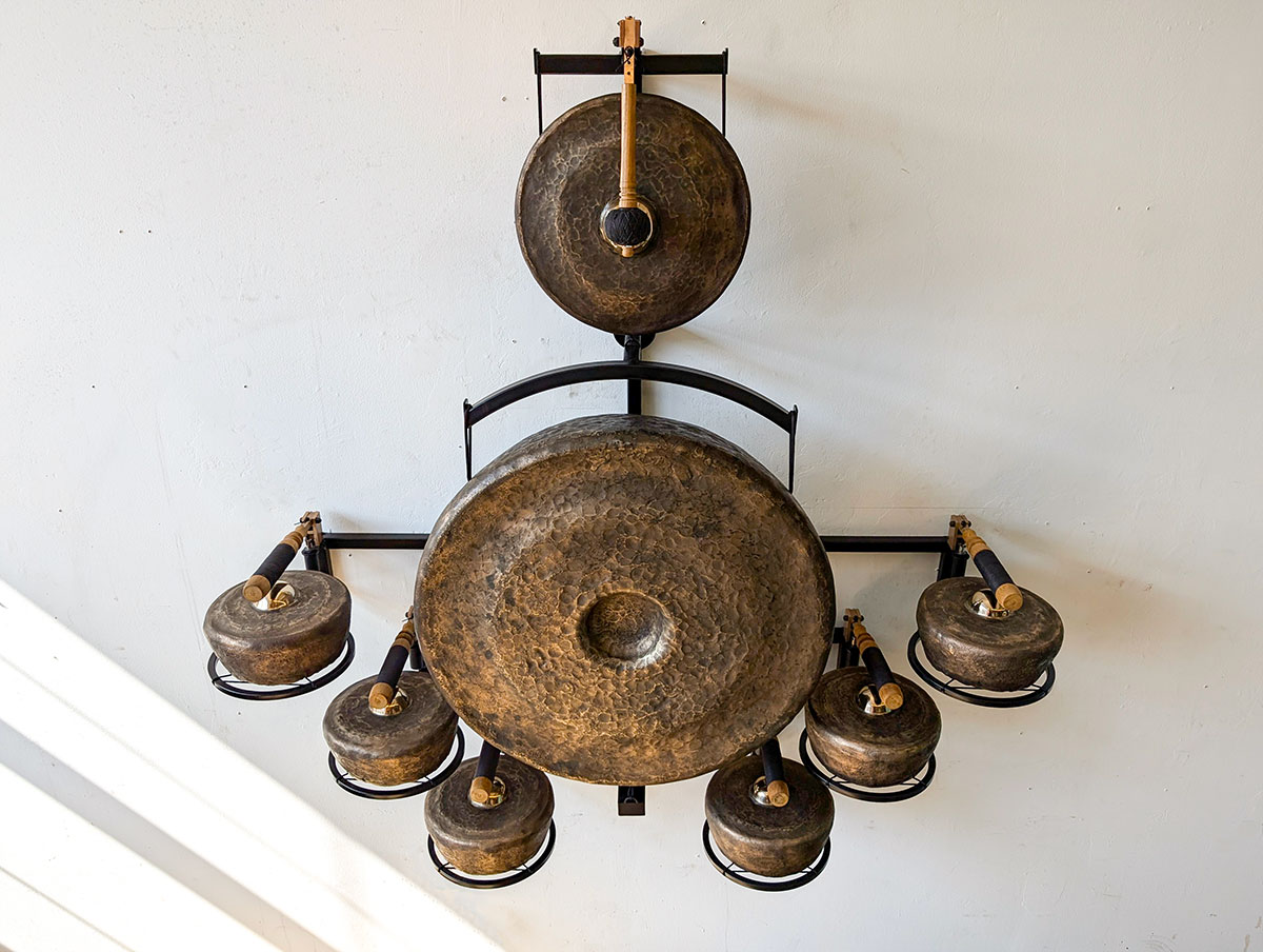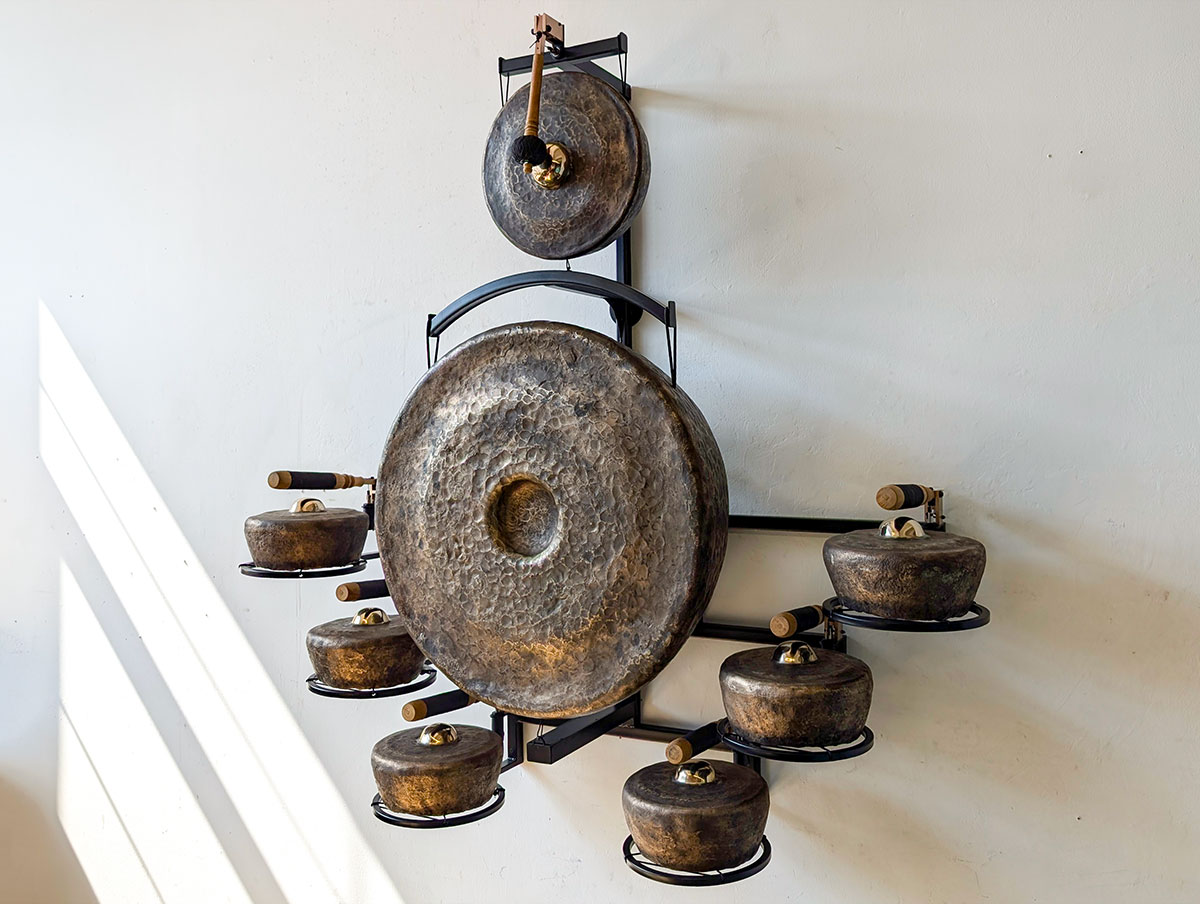 Description: Gamelatron Roh Pendamping (which translate to Companion Spirit in Bahasa), is a sonic kinetic sculpture by Aaron Taylor Kuffner, featuring 8 hand forged bronze gongs (largest is 70cm and we tuned it to about 59Hz) on a powder coated steel wall mounted sculpture with anodized aluminum and teak wood mechanical mallets connected to a physical computing system.