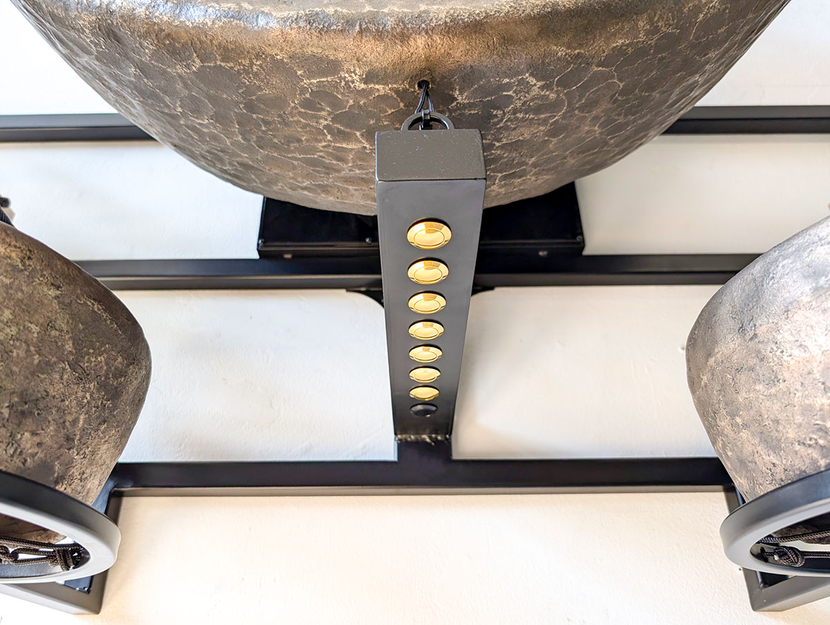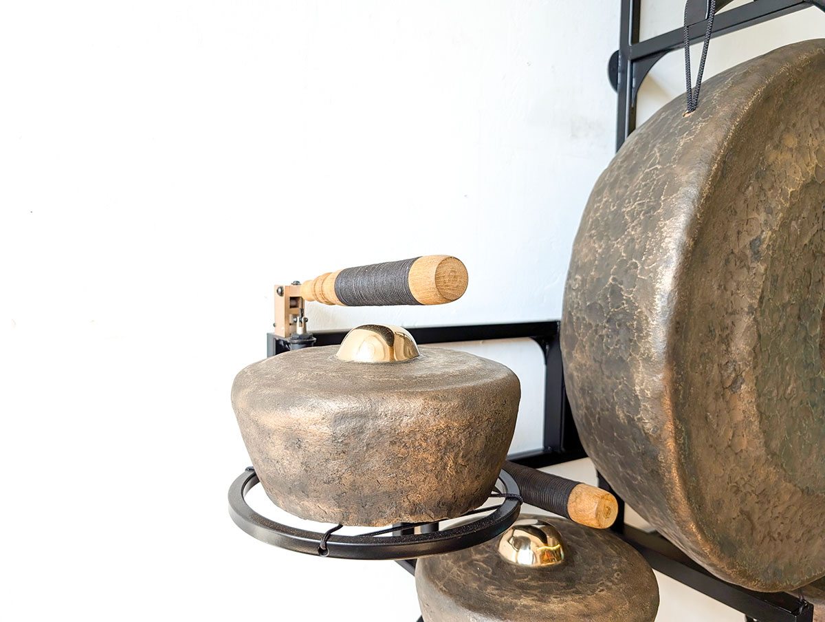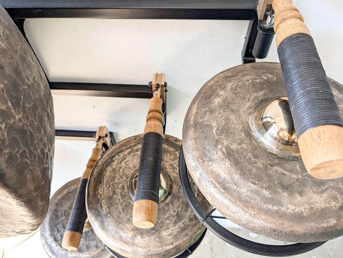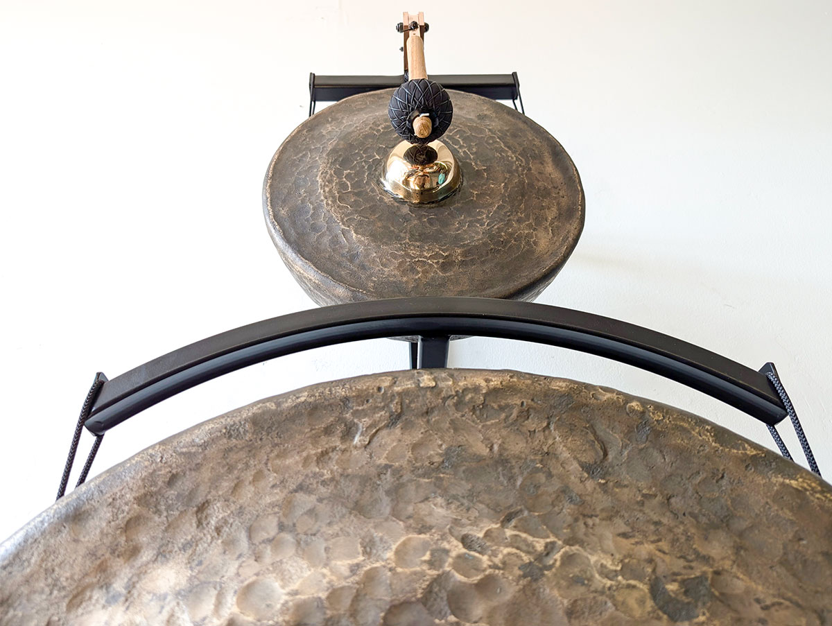 Description: Gamelatron Roh Pendamping (which translate to Companion Spirit in Bahasa), is a sonic kinetic sculpture by Aaron Taylor Kuffner, featuring 8 hand forged bronze gongs (largest is 70cm and we tuned it to about 59Hz) on a powder coated steel wall mounted sculpture with anodized aluminum and teak wood mechanical mallets connected to a physical computing system.
