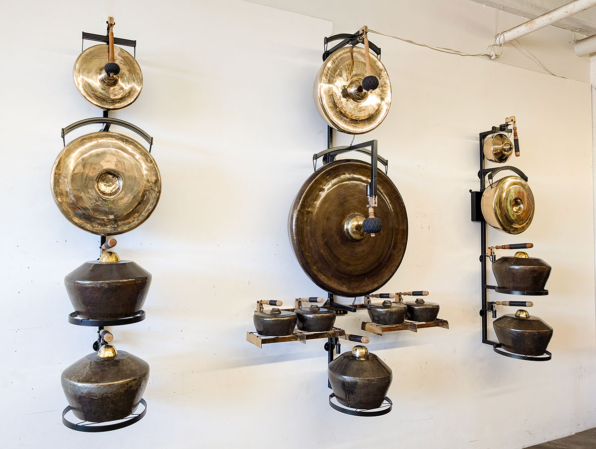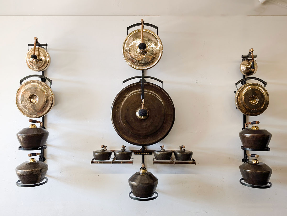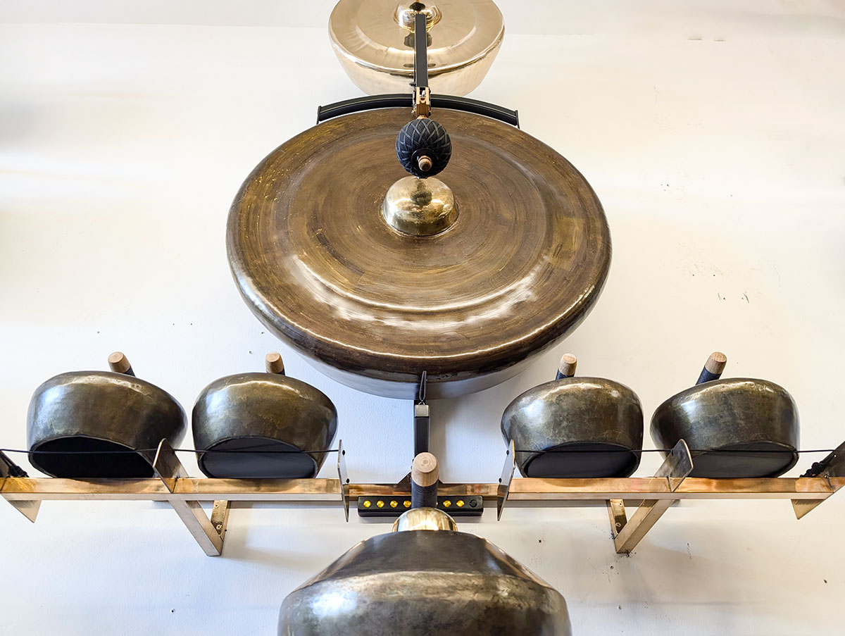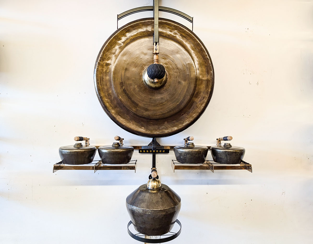 Description: Gamelatron Tangan Ke Hati (which translate to Hand on Heart in Bahasa), is a sonic kinetic sculpture by Aaron Taylor Kuffner, featuring an 80cm gong made of patinated steel and Brass, 5 kenong gongs made of patinated steel and brass, 3 mirror polished bronze kempul, 1 mirror polished bronze bende, 1 mirror polished bronze kempyang, and 4 patinated steel bonang, on a wall mounted Triptych made of powder coated Steel, and coppernickel mounts, anodized aluminum and teak wood mechanical mallets and a physical computing system.