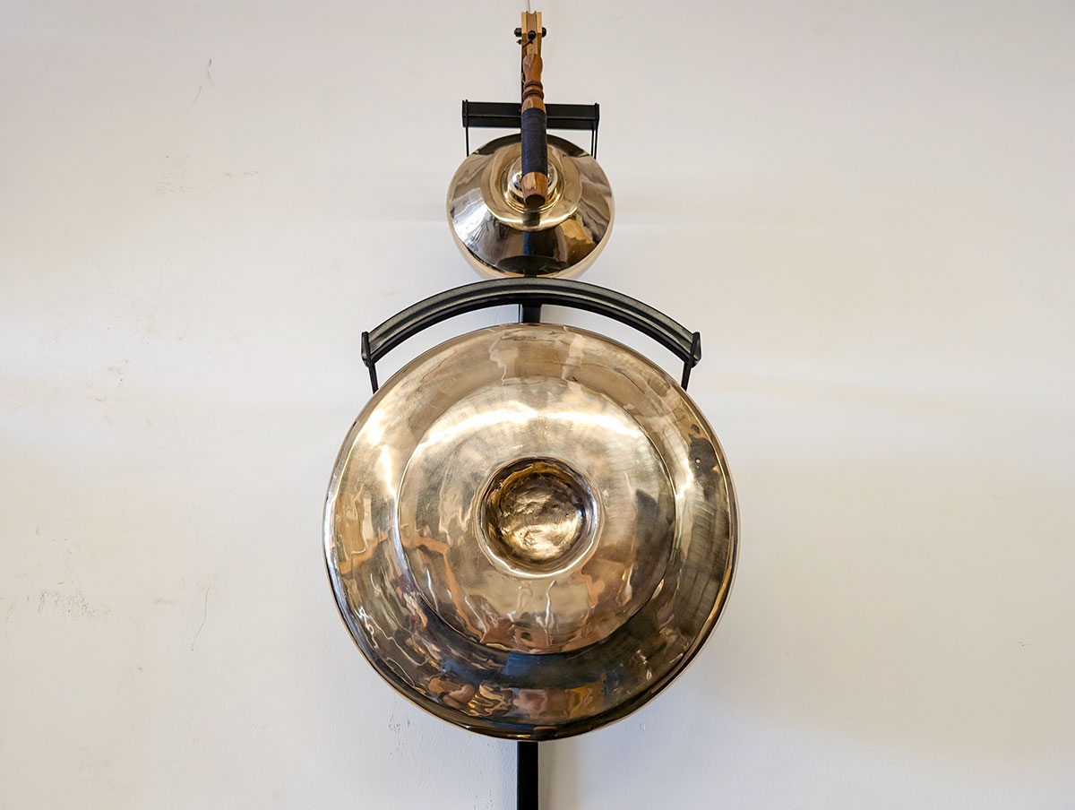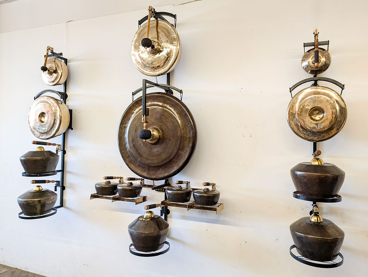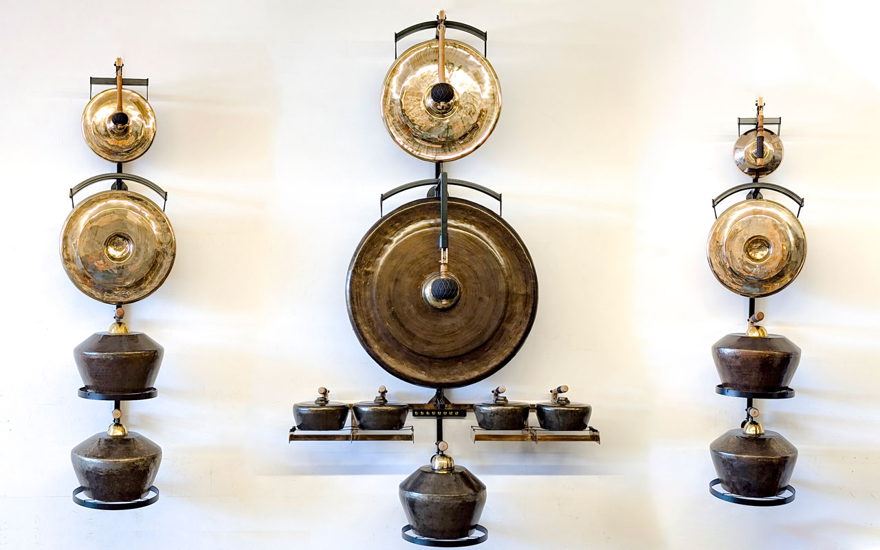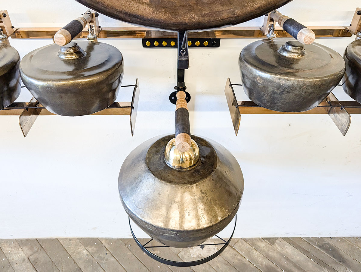 Description: Gamelatron Tangan Ke Hati (which translate to Hand on Heart in Bahasa), is a sonic kinetic sculpture by Aaron Taylor Kuffner, featuring an 80cm gong made of patinated steel and Brass, 5 kenong gongs made of patinated steel and brass, 3 mirror polished bronze kempul, 1 mirror polished bronze bende, 1 mirror polished bronze kempyang, and 4 patinated steel bonang, on a wall mounted Triptych made of powder coated Steel, and coppernickel mounts, anodized aluminum and teak wood mechanical mallets and a physical computing system.