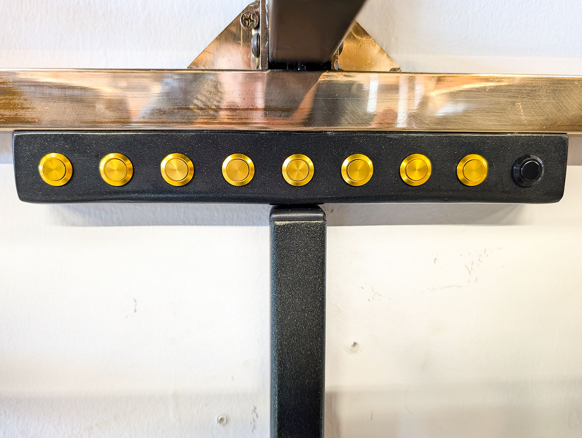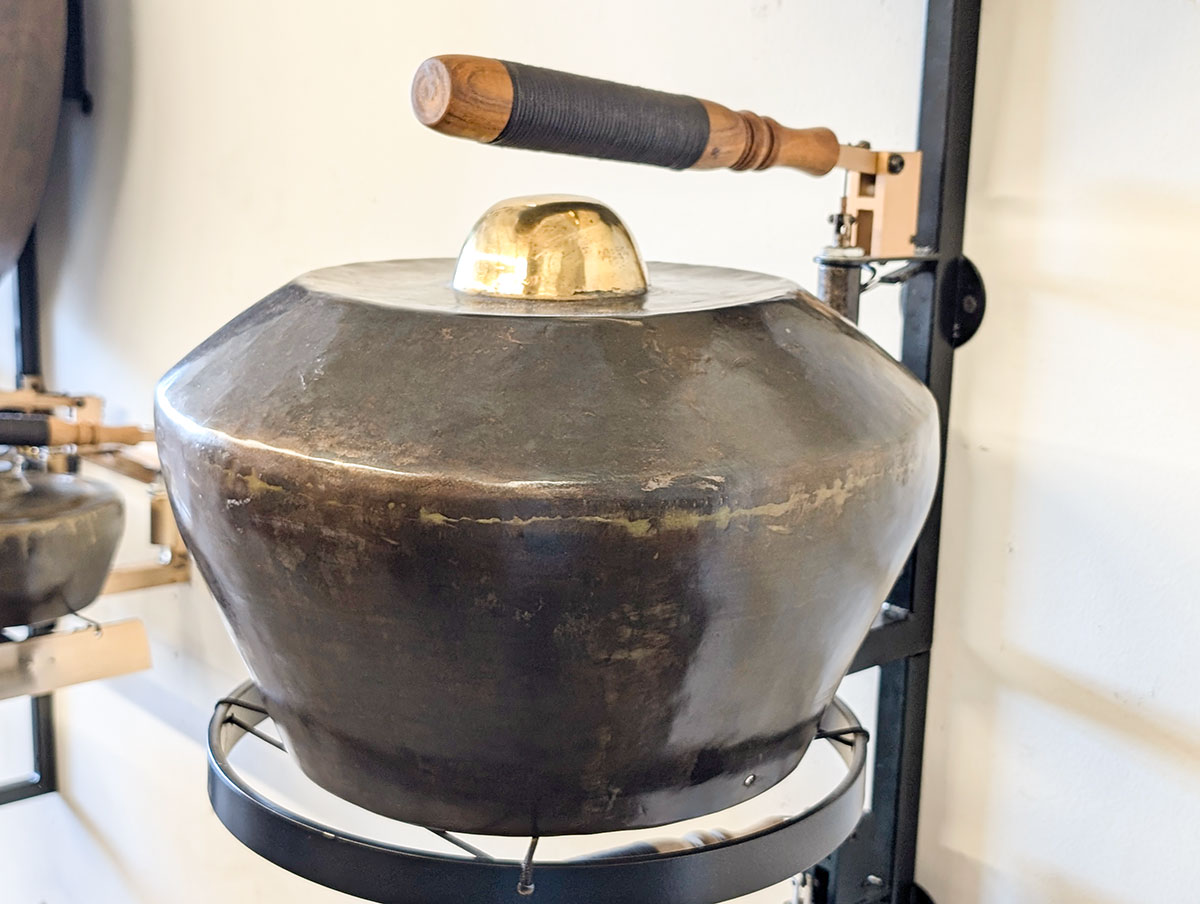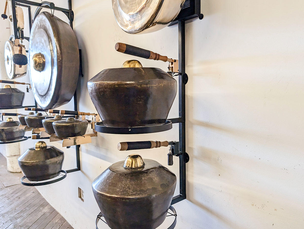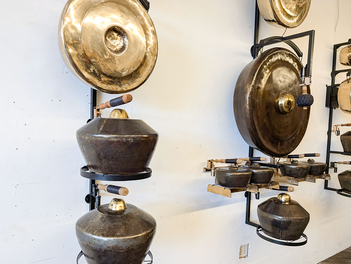 Description: Gamelatron Tangan Ke Hati (which translate to Hand on Heart in Bahasa), is a sonic kinetic sculpture by Aaron Taylor Kuffner, featuring an 80cm gong made of patinated steel and Brass, 5 kenong gongs made of patinated steel and brass, 3 mirror polished bronze kempul, 1 mirror polished bronze bende, 1 mirror polished bronze kempyang, and 4 patinated steel bonang, on a wall mounted Triptych made of powder coated Steel, and coppernickel mounts, anodized aluminum and teak wood mechanical mallets and a physical computing system.